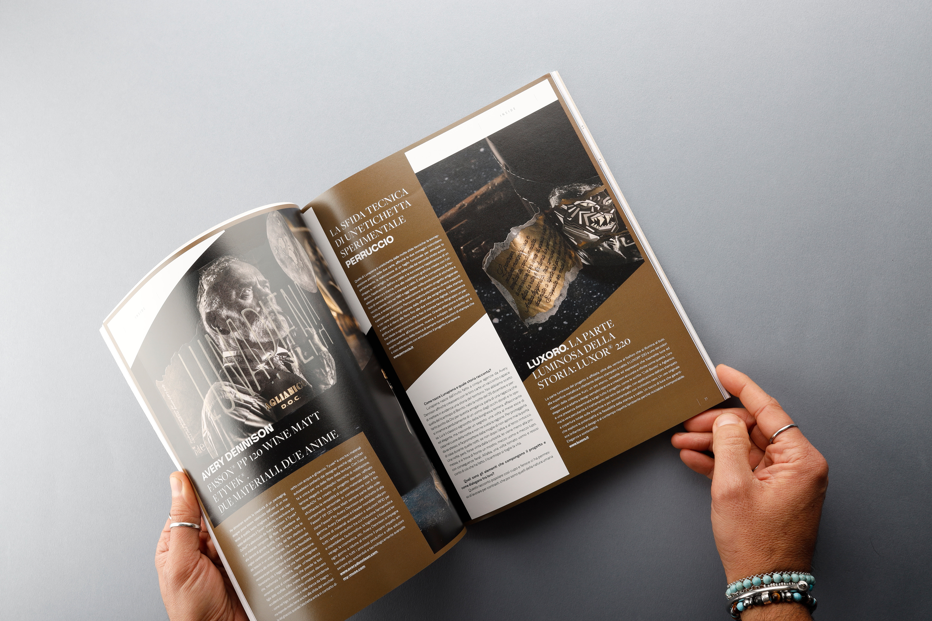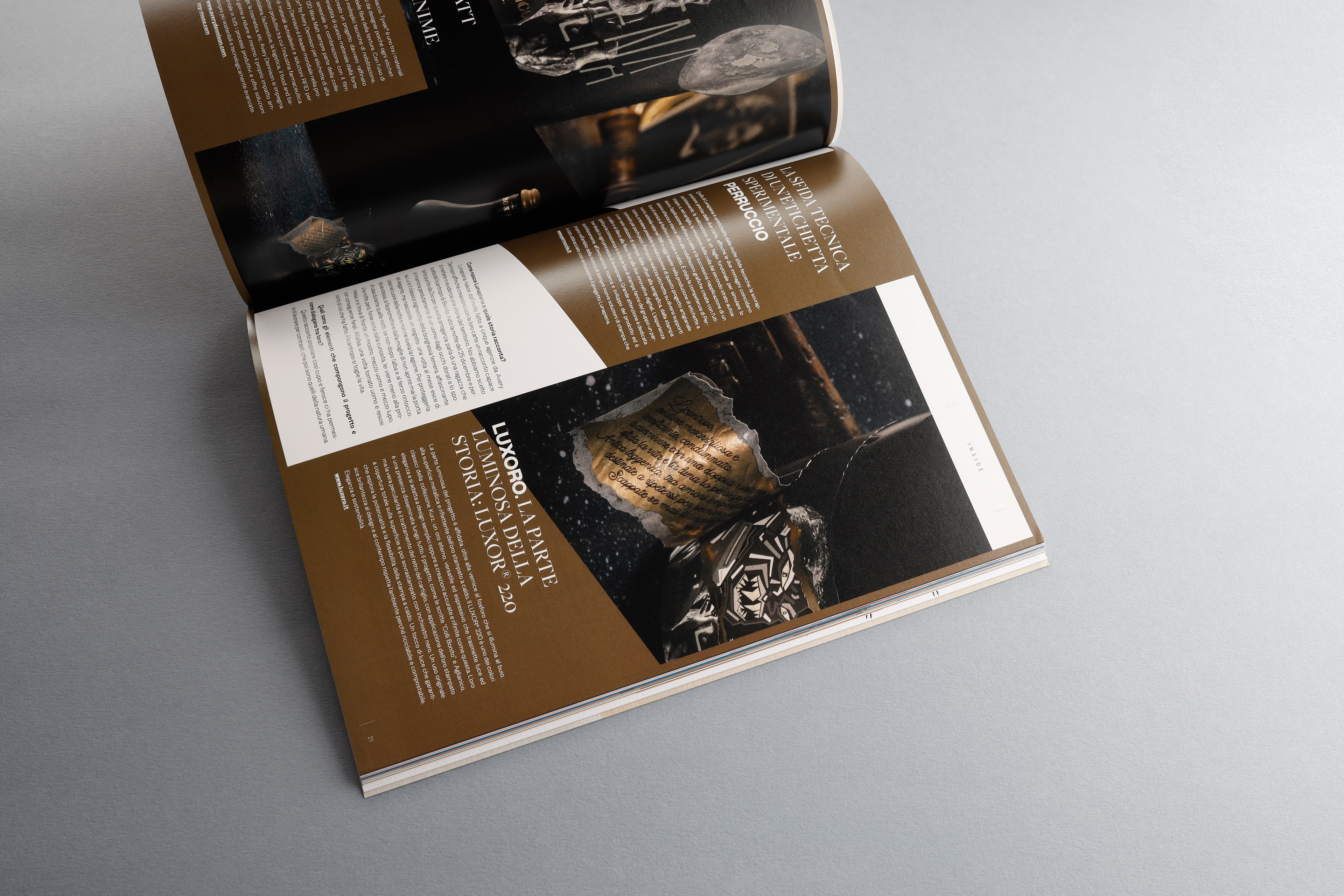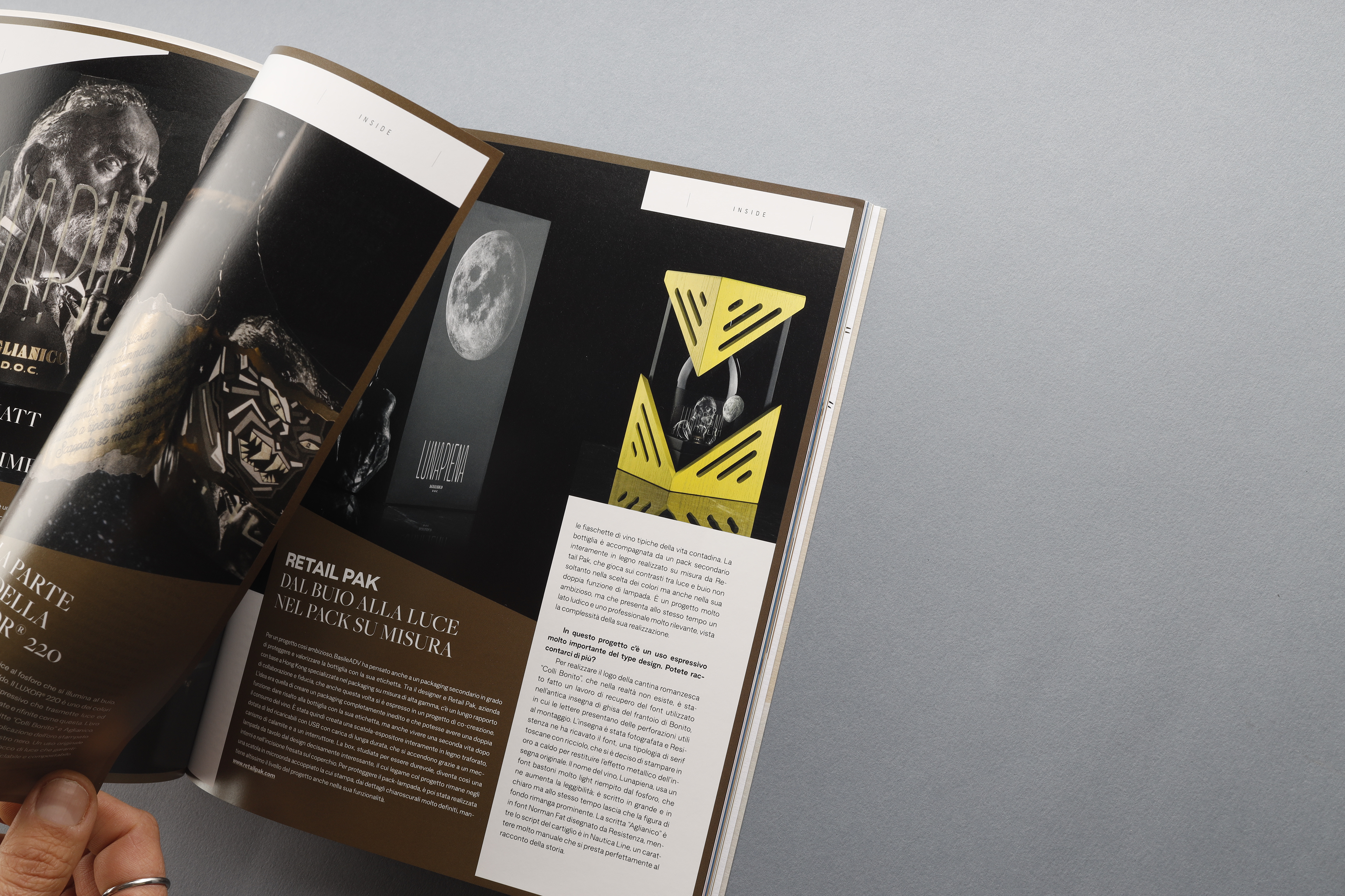 BasileADV con la type foundry Resistenza e cinque grandi partner: Avery Dennison per i supporti autoadesivi, Estal per la bottiglia di vetro, Perruccio per la stampa dell'etichetta, Luxoro per le nobilitazioni a caldo e Retail Pak per il packaging seconda-rio.
